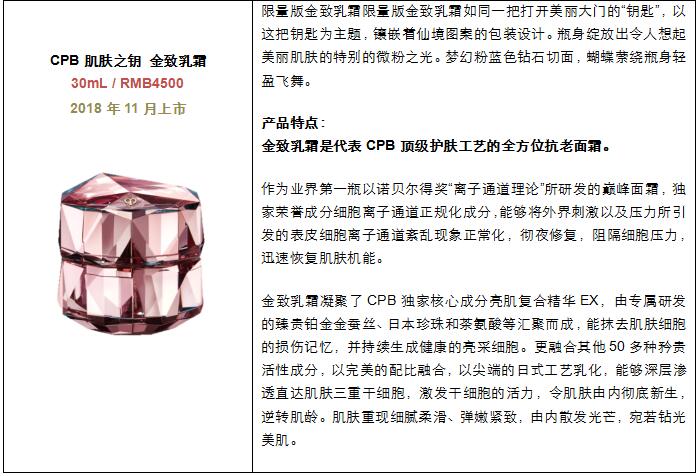 限量系列的金致乳霜绽放出别致的微粉之光。梦幻的粉蓝色钻石切面闪耀夺目,精巧的蝴蝶萦绕着瓶身轻盈飞舞。金致乳霜凝聚了CPB独家核心成分亮肌复合精华EX,由专属研发的铂金金蚕丝、日本珍珠和茶氨酸等50多种珍稀成分凝聚而成,以尖端的日式工艺乳化,激发干细胞活力,陪伴爱美女性打造极致钻光美肌,释放由内而外的耀目光芒。