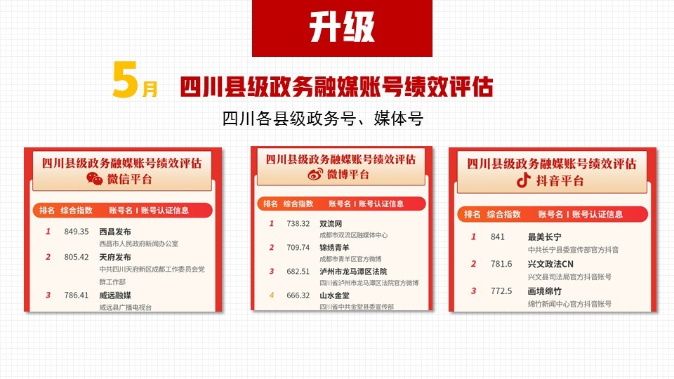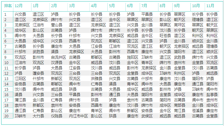 通过统计四川各县(市、区)在央媒、省媒平台的传播表现,综合指数所统计到的微信、微博、抖音、头条号等平台的数据,分析得出总榜排名。