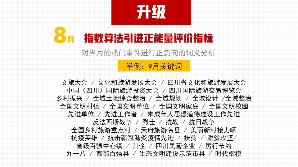 为进一步贯彻落实习近平总书记对宣传思想工作的重要指示精神,突出四川县级综合传播力的正向效用,进一步弘扬正能量,2020年8月起,指数算法将引进正能量评价指标,通过对当月的热门事件进行正负向的词义分析,如县(市、区)传播力热度突显了重大主题的正向传播,则相应加分,反之,若有县(市、区)传播力热度主要来自恶性负面事件,则会相应减分。通过专项大数据挖掘分析形成正能量评价指标,构建更加科学合理的指数评价体系。