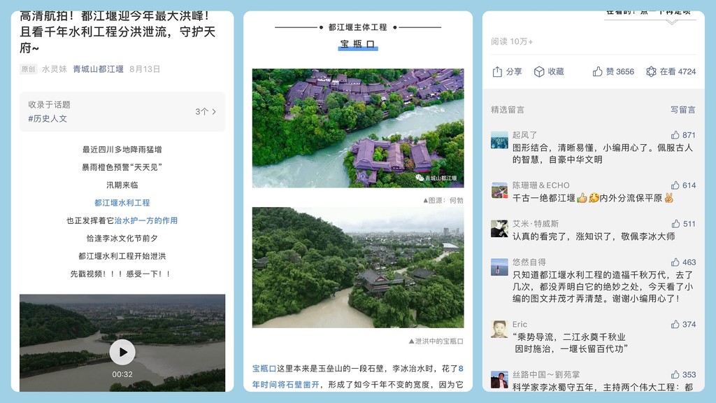 “青城山都江堰”微信号发布的《高清航拍!都江堰迎今年最大洪峰!且看千年水利工程分洪泄流,守护天府》文章,对都江堰分洪泄流功能进行简单易懂的科普解读,成为8月传播数据最高的文章。