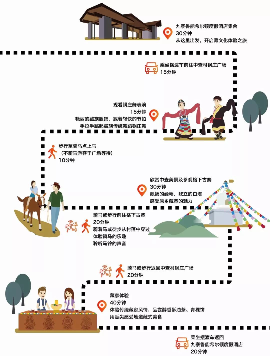 想象一下在查村锅庄广场感受九寨原汁原味的锅庄舞表演,然后策马扬鞭体验马背上的自在感觉,漫步在格下古寨的街道巷里,欣赏藏家民居与风情,一边是美景的天上仙境,一边是烟火的喜乐人间。