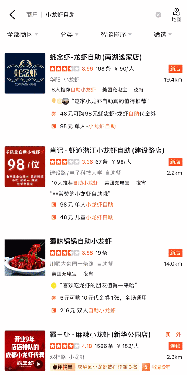 从大众点评搜“小龙虾自助”?,可以看到搜出的结果有850多个,但其实仔细分辨