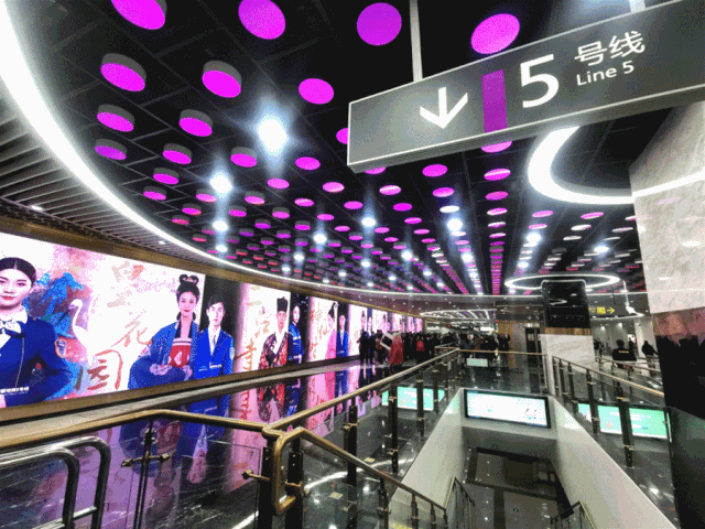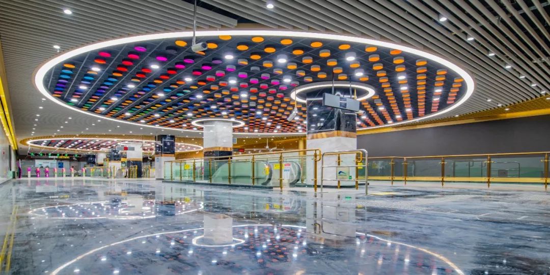 随后我们去到青羊宫站。 5号线全线设计了5个艺术重点站、9个艺术站,以及27个标准站。 青羊宫站就是五大重点艺术站之一。 看站顶,像不像野狼disco里的闪耀灯球……