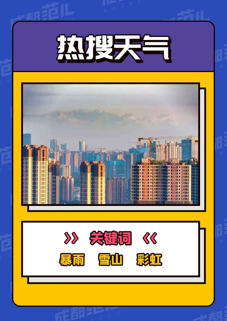 成都是一座靠天气就能频上热搜的城市,朝霞、晚霞、出太阳、看雪山、出彩虹,甚至刮大风,都是上榜的理由,以此说明成都的宜居、成都人“惊抓抓”的性格。