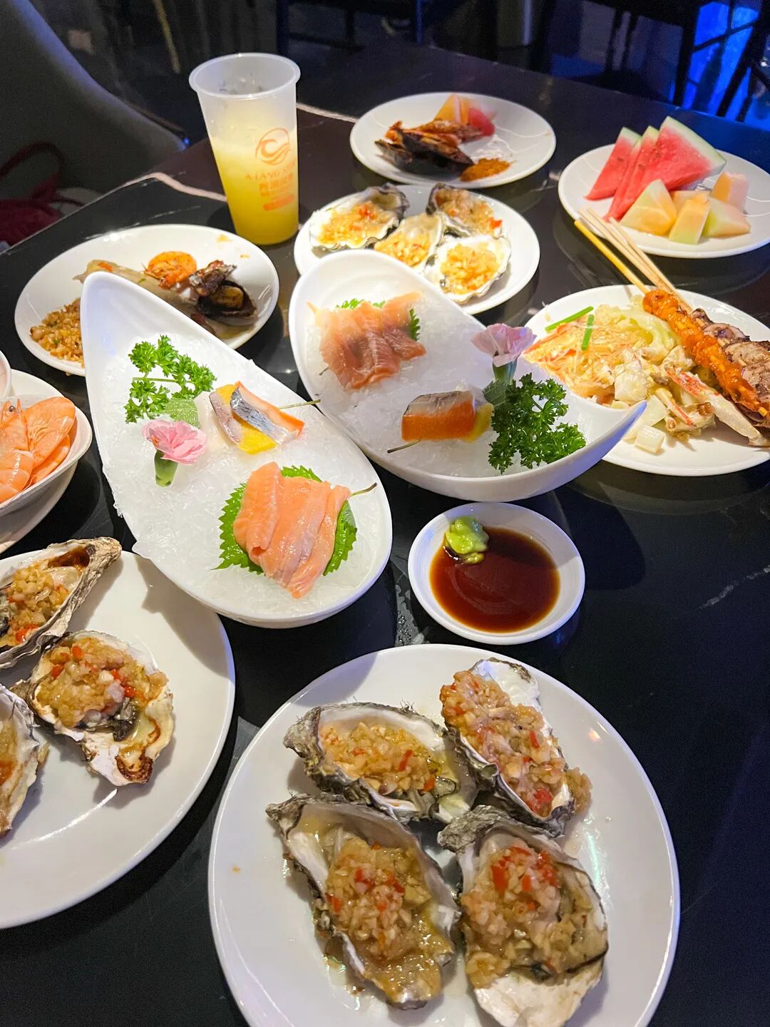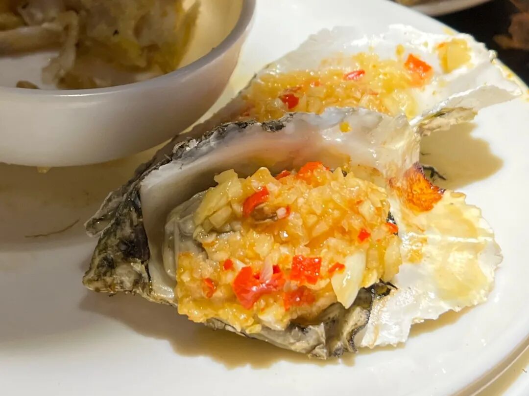等,各种风味的都有。烤生蚝的品质还可以,蚝肉新鲜且大、味道也好,师傅一直都在烤,随时去都能拿上一两盘;有一款炒蟹也不错,肉多、鲜味足。不过三文鱼刺身是雷点,不是很新鲜啦。