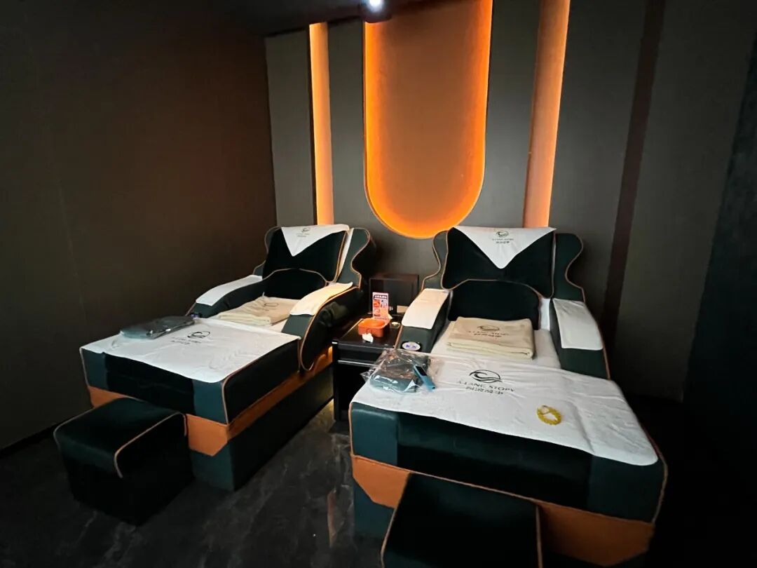 来到按摩房间,两台巨大的按摩椅映入眼帘,没见过世面的我们一下兴奋起来。