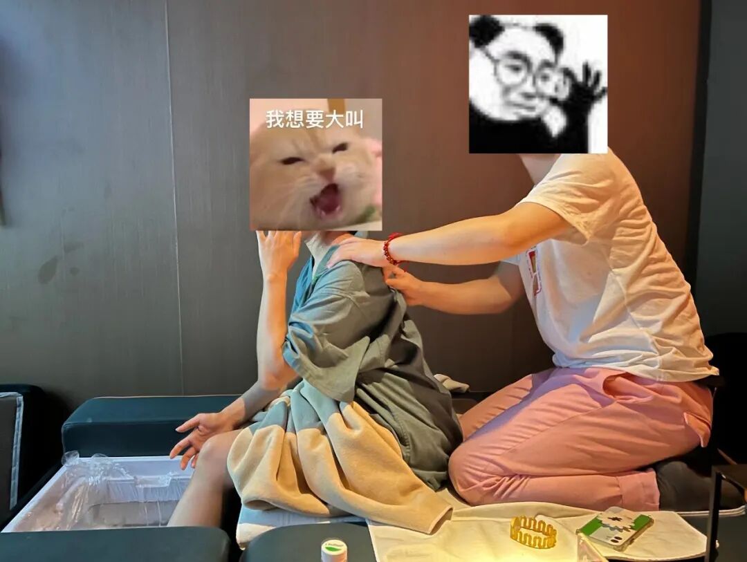 60min的肩颈推拿 ,专门针对久坐族打工人,推拿包括肩颈、背部和手臂。作为按摩spa沉迷用户,个人感觉技师手法还不错,整个过程也不会扭到摆龙门阵。不过放松肩颈 ,个人还是强推泰式更带劲儿 !同事体验的足部按摩,表情如下图?