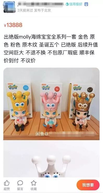 但很遗憾我没抢到。想去咸鱼上碰碰运气被高价逼退了。一只Molly粉色海绵宝宝最高价已经炒到了2300,比原价高了近6倍。现在它还在我种草单上,没拔下来。