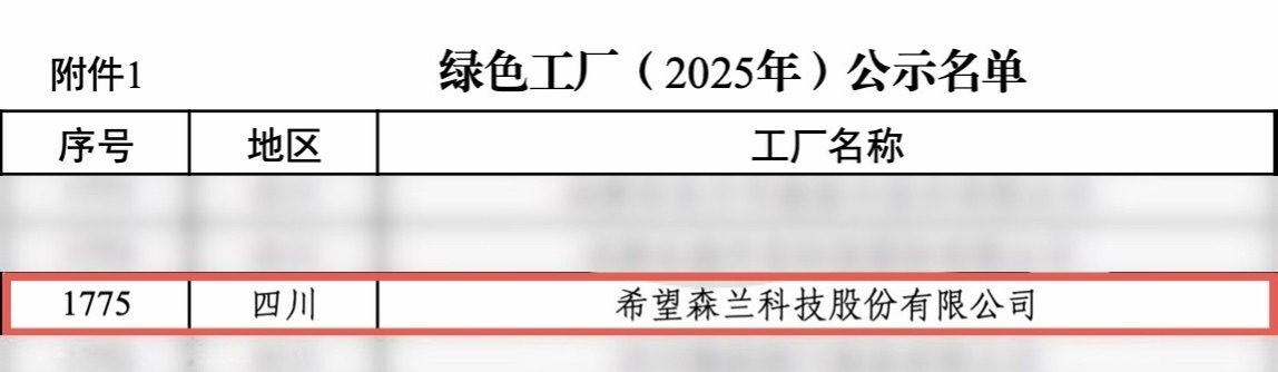 近日,国家工业和信息化部公布了绿色工厂、绿色工业园区(2025年)名单,希望森兰科技股份有限公司成功获评国家级“绿色工厂”。