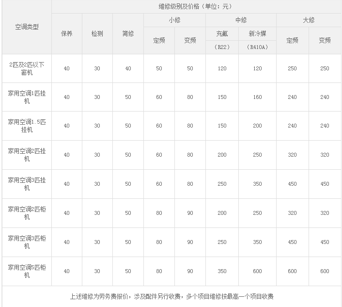 空调维修方面,同样按照空调匹数、柜挂机、不同维修程度分别定价。所有类型的家用空调,保养40元、检测30元、简修50元;保有量最高的1.5P家用挂机,小修价格60-80元、中修充氟150元、充新冷媒200元、大修最高240元封顶。