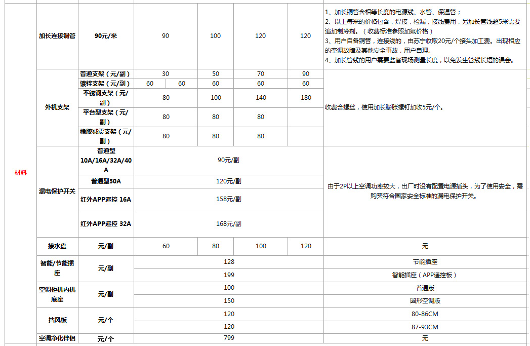 材料方面,加长铜管根据空调匹数不同收费不同,1-1.5P、2P、3P、5P每米价格分别为90元、100元、120元、120元;外机支架按照本身材质不同、空调匹数不同,定价从1.5P普通支架最低30元,到5P空调不锈钢支架的180元不等,普遍均在100元以内。