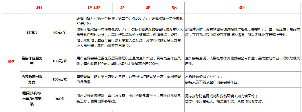 以空调安装为例,各种服务类型、材料均给出价格标准。以上海为例,打墙孔的收费为混凝土墙水钻一次性成孔80元/个、砖墙电钻开孔第一个免费,第二个开孔50元/个;空调安装位置在四层及四层以上且为室外作业,需收取高空作业服务费,每台收费100元,同地址多台安装最高收取200元。