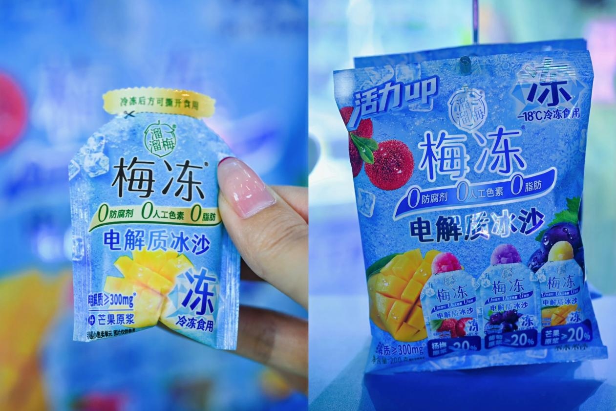 以梅冻电解质冰沙系列为例,这款产品精准切入了夏日运动补水、补充电解质场景。与传统棒棒冰不同,该产品添加钾、钠矿物质元素,电解质≥300mg打造健康冻品,实现了"常温保存、冷冻食用"的便捷体验,在便利店、商超、零食店等零售点铺货。2024年仅销售两个月就卖出60万+箱,今年更是提前两个月启动铺货。