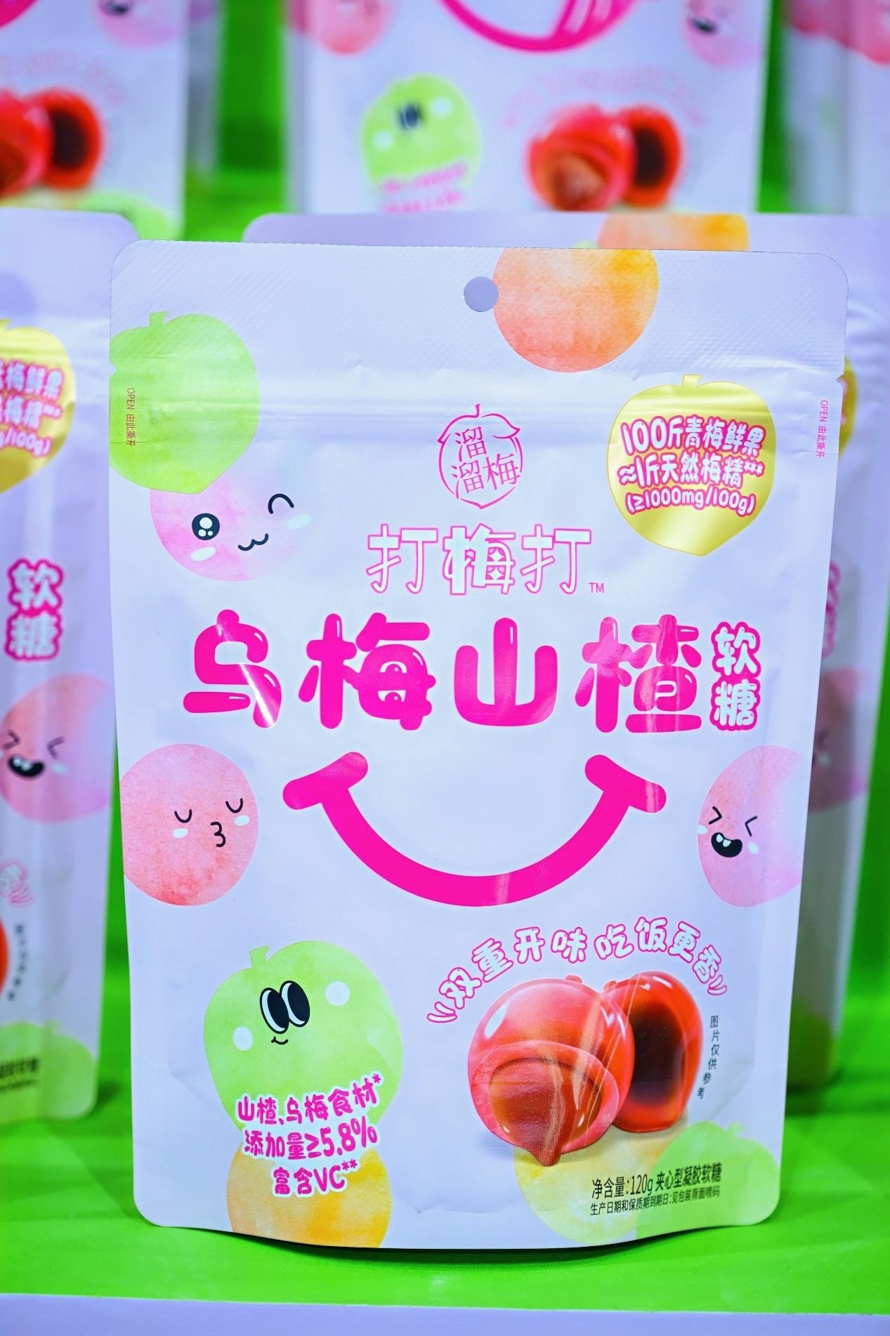 打梅打乌梅山楂软糖也是一个典型案例,这款产品攻克了软糖pH值过低不能成型的技术壁垒,以溜溜梅自研梅精为核心,外裹山楂原浆,实现"零色素、零防腐剂、富含维生素C"的健康属性,成为小朋友们的开味神器。