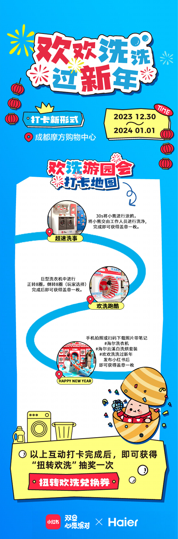 2023年12月30日至2024年1月1日,以“欢欢洗洗过新年”为主题的2023年小红书&海尔联名线下快闪活动将在合景·摩方(成都)南广场举行。在即将到来的元旦假期,成都的消费者将感受到与众不同的互动体验。