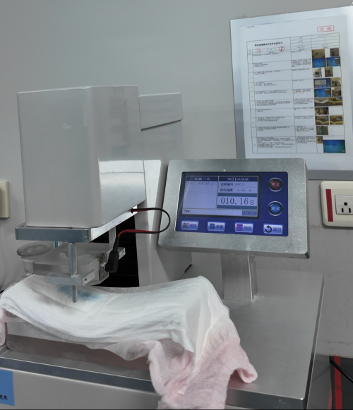 比如最直观的吸收速度测试——依据国标,工作人员将5毫升试液注入一片随机抽取的卫生巾,10秒后,液面已完全消失,手指轻触表面,干爽不粘腻。“国标要求是60秒内,而我们的内控基准较国标严格数倍。” 工作人员补充道。