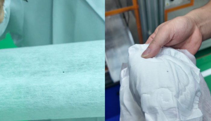 为验证其灵敏度,现场进行了一个微型挑战:在一卷即将投入生产的无纺布原料上,用记号笔做了一个约半粒米大小的极轻微标记。随后,这卷材料被送入生产线。通过设备自动计算排出,一片成品被精准地弹入旁边的“不合格品”收集箱——正是我们做过标记的那一片。