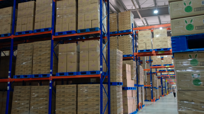 即使被判定为合格,一片卫生巾的“准出”仍需等待。在面积约2.4万平方米的封闭式立体仓库里,成品按批次整齐码放。