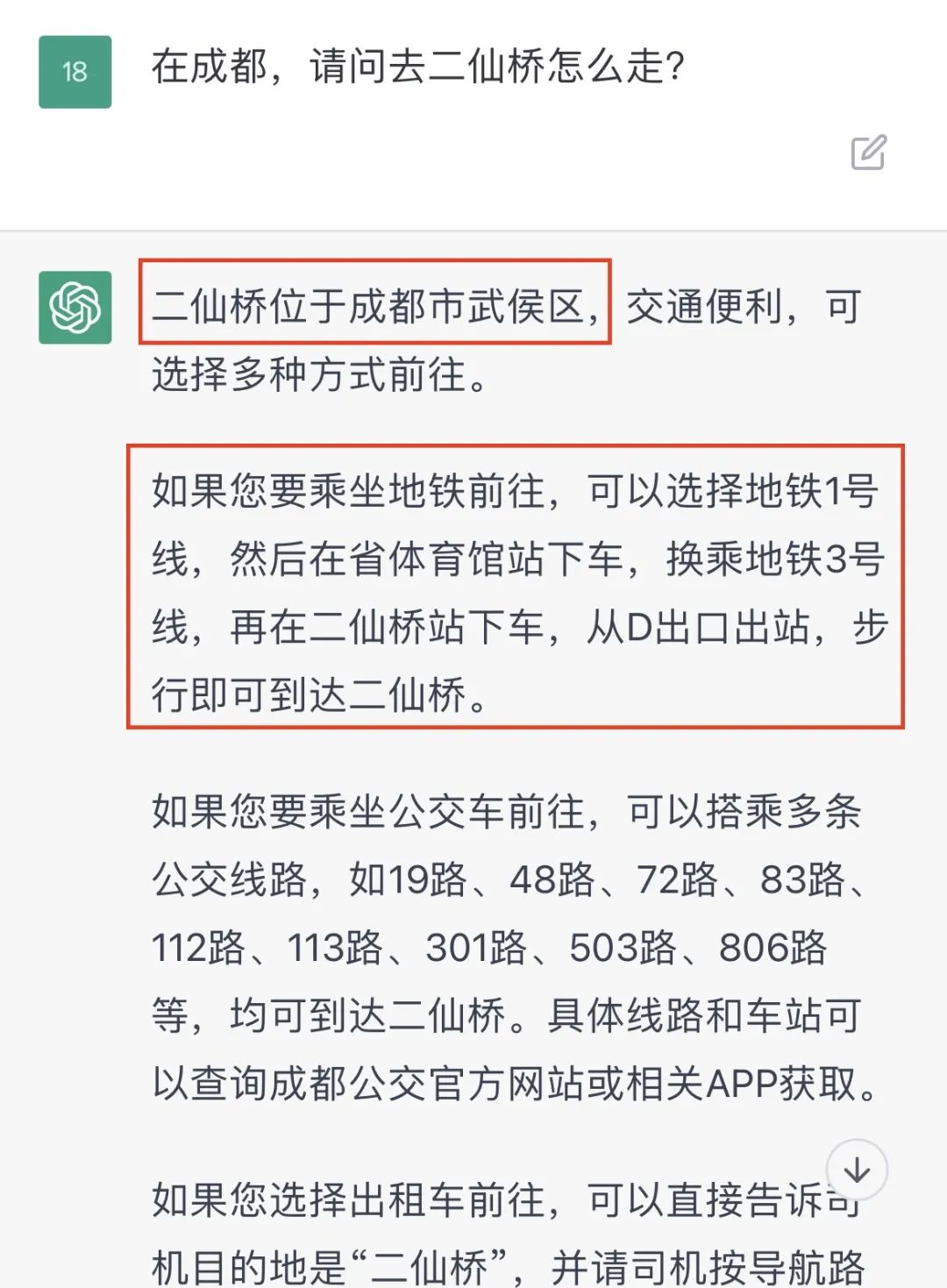 但接下来这个问题,令人失望了! 它不仅不知道“要走成华大道”,甚至还在打胡乱说“二仙桥在成都武侯区 ,坐地铁3号线…”?