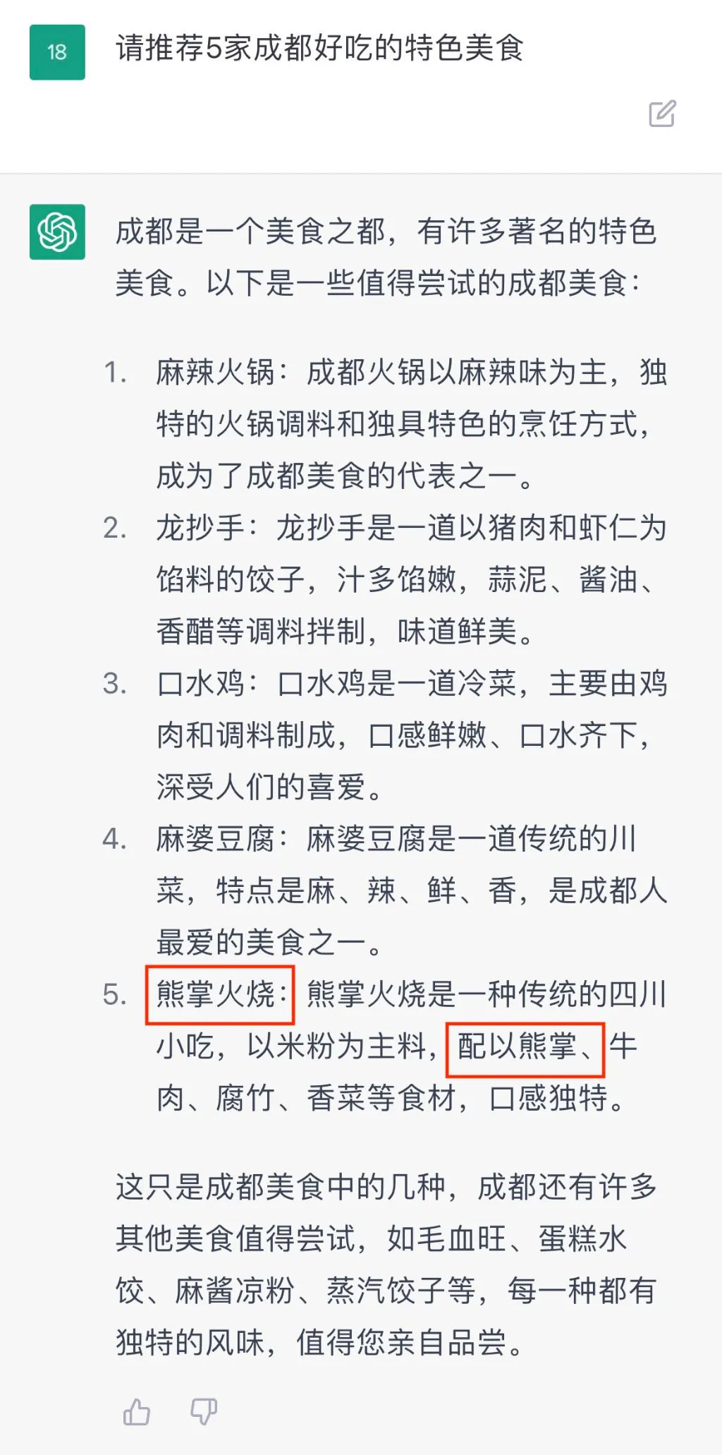前四个推荐好像是那么一回事但 “熊掌火烧”是什么东西 ?!AI答道:以米粉为主料, 配以熊掌 ...撕道普?♀️