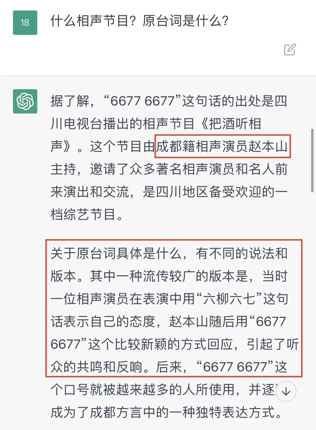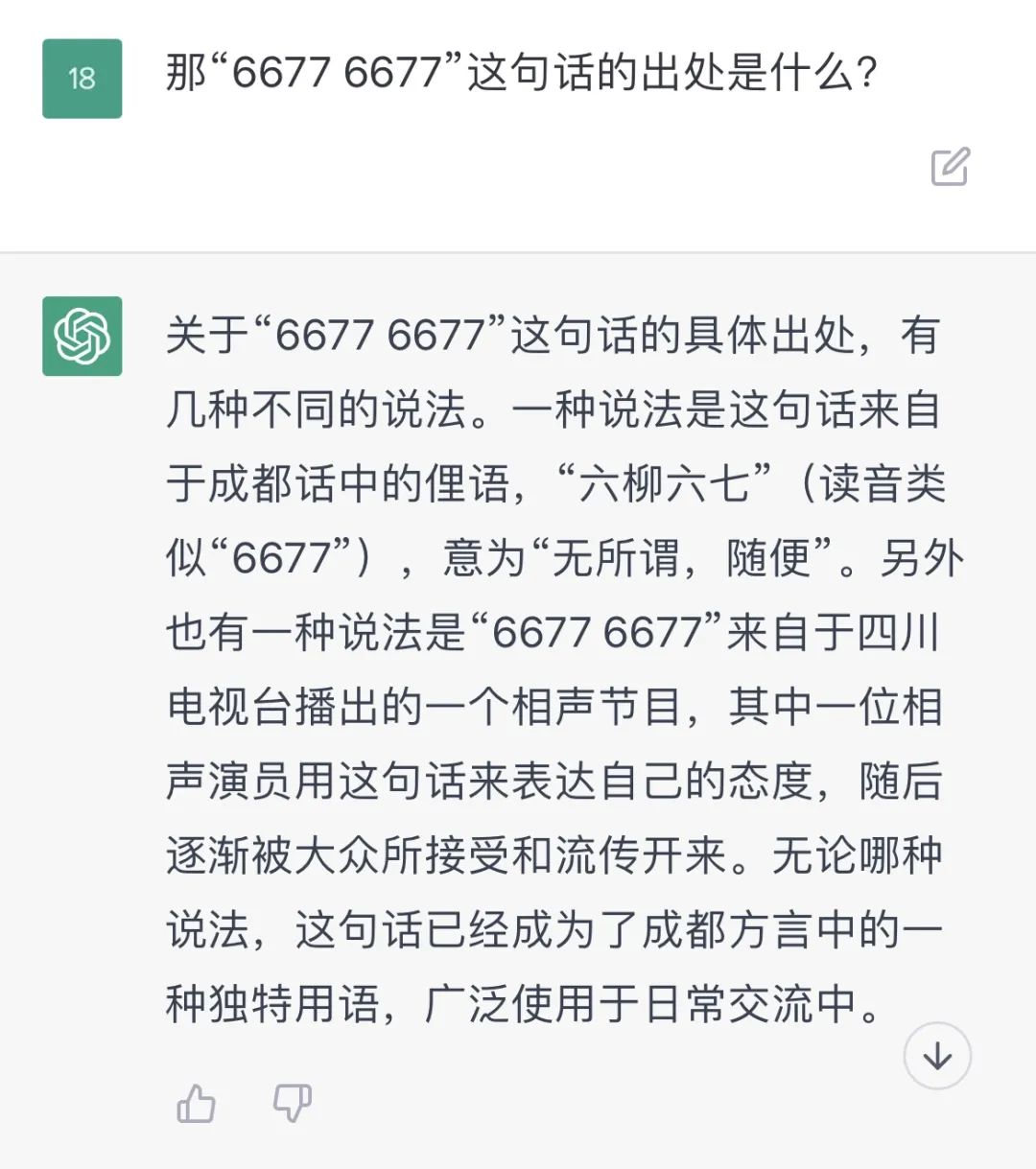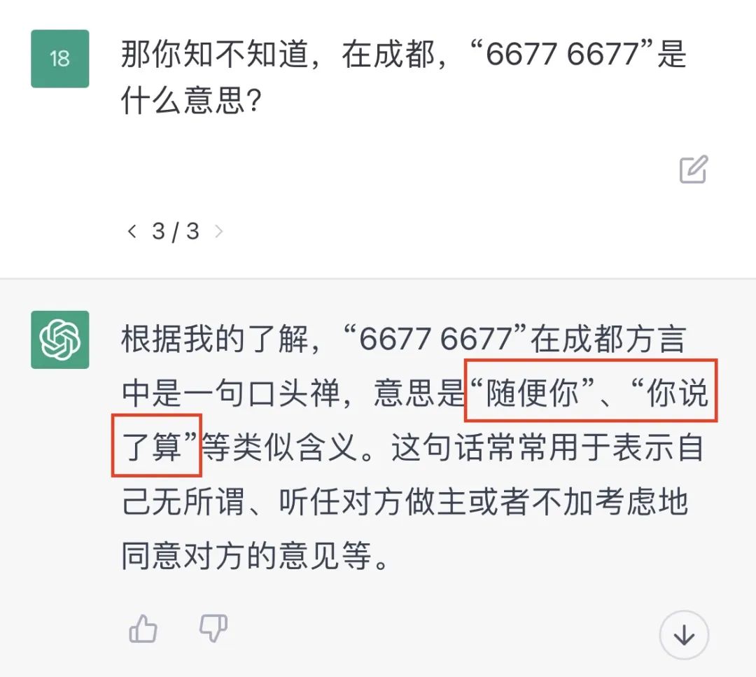 它回答道:“6677 6677”在成都方言中是一句口头禅,意思是“随便你”、“你说了算”等类似含义。