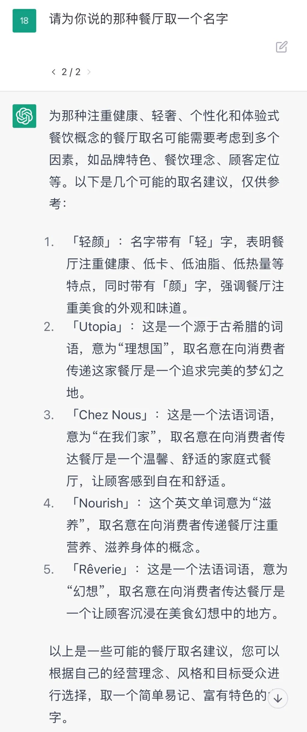 未雨绸缪,请C娃帮我 给我的餐厅取名字 ,想象中会是一些赛博朋克儿的风格,但没想到 中文、英语、法语、古希腊词他都帮我想到了 ,感觉随便哪个开在望平街都洋气得很喃!