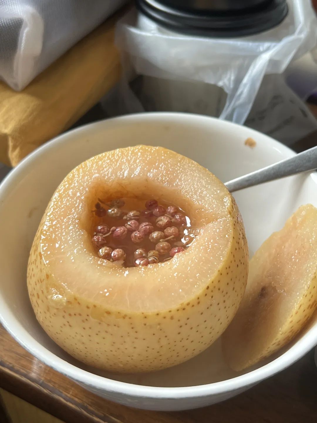 嗓子不舒服的话,这个花椒冰糖蒸雪梨可以试试,很怪但真的有用 !花椒和雪梨一顿蒸煮后,反而出现了些悦人的香气。花椒放多了,喝起麻感很强,但是嗓子确实舒服了不少,梨儿也好吃,也能顺喉咙。