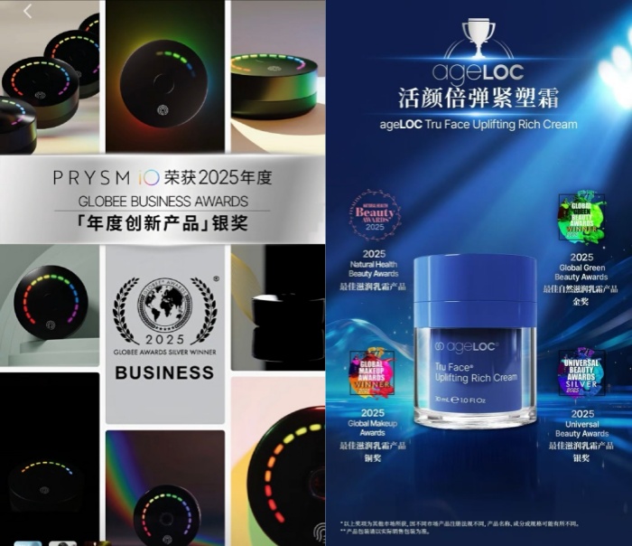 欧睿国际最新调研数据显示,如新是 2023 和 2024 连续两年全球零售额第一的美容与健康仪器系列公司(数据源自 Euromonitor International Limited;按 2023 和 2024 全球各公司居家美容与健康仪器系列整体零售渠道零售额,不包含美容院线服务,于 2025 年 7 月完成调研),彰显了其在仪器护肤领域的全球领先地位。在 2025 Global Makeup Awards(2025年度全球化妆大奖*)评选中,如新产品凭借出众的产品力在近十个品类中脱颖而出,收获多项重磅奖项:ageLOC Tru Face Refining Toner(活颜精萃水)荣获最佳护肤产品银奖*;ageLOC Tru Face Uplifting Rich Cream(活颜倍弹紧塑霜)与ageLOC Tru Face Essence Ultra(活颜倍弹源液)分别斩获最佳滋润乳霜产品铜奖及最佳精华产品银奖*。近期推出的超光谱智能扫描仪 Prysm iO 荣获 2025 年度 Blobee Business Awards 年度创新产品银奖*。