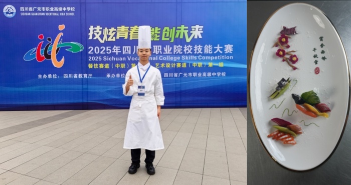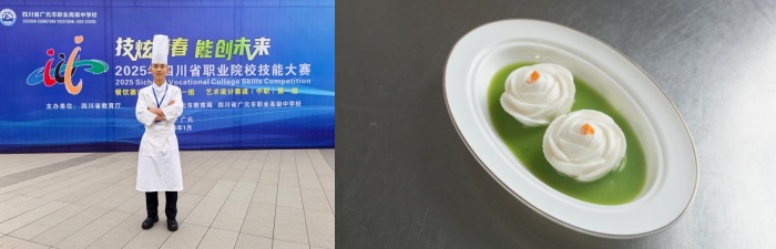 贺家林的家乡在江西省萍乡市莲花县,2024年成为李锦记希望厨师入读成都财贸职高,因为具有绘画天赋,他在食品雕刻和冷拼作品呈现上的能力脱颖而出,辅以平日的勤学苦练,多次参加校内外活动提升自我技能水平,并代表学校参加2025年度成都市中职学生技能大赛,获得团队二等奖。这次他负责的是冷拼作品《踏雪寻梅》,“这道菜的清鲜咸香味型,适配小雪节气赏雪寻梅雅趣,创意源自“窗含西岭千秋雪”,以全可食食材,用精准刀工塑造积雪、雪山的视觉效果,搭配梅枝、亭台雅致造型,还原诗意意境。”
