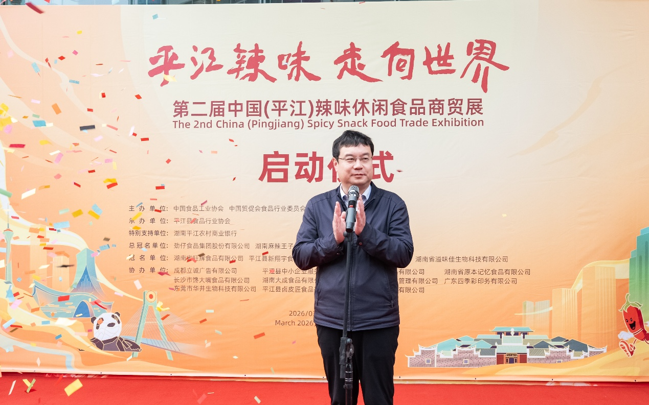 启动仪式现场,主持人代表活动组委会,向远道而来的参展企业、全国各地嘉宾及经销商朋友们,致以诚挚的欢迎与衷心的感谢。平江县食品行业协会理事长徐望辉发表致辞,他细数平江辣味从酱干起家到形成多品类产业集群的发展渊源,阐释此次择址成都办展的深意——依托成都“世界美食之都”的区位优势与糖酒会的行业热度,以成都为窗口让平江辣味走向更广阔市场,同时分享了平江食品产业向标准化、品牌化、健康化升级的创新成果,表达了平江食品人抱团发展、携手客商共赢的愿景。随后,中国食品工业协会产业集群工作发展部主任、中国贸促会食品行业委员会秘书长沈志勇宣布本届商贸展正式启动。
