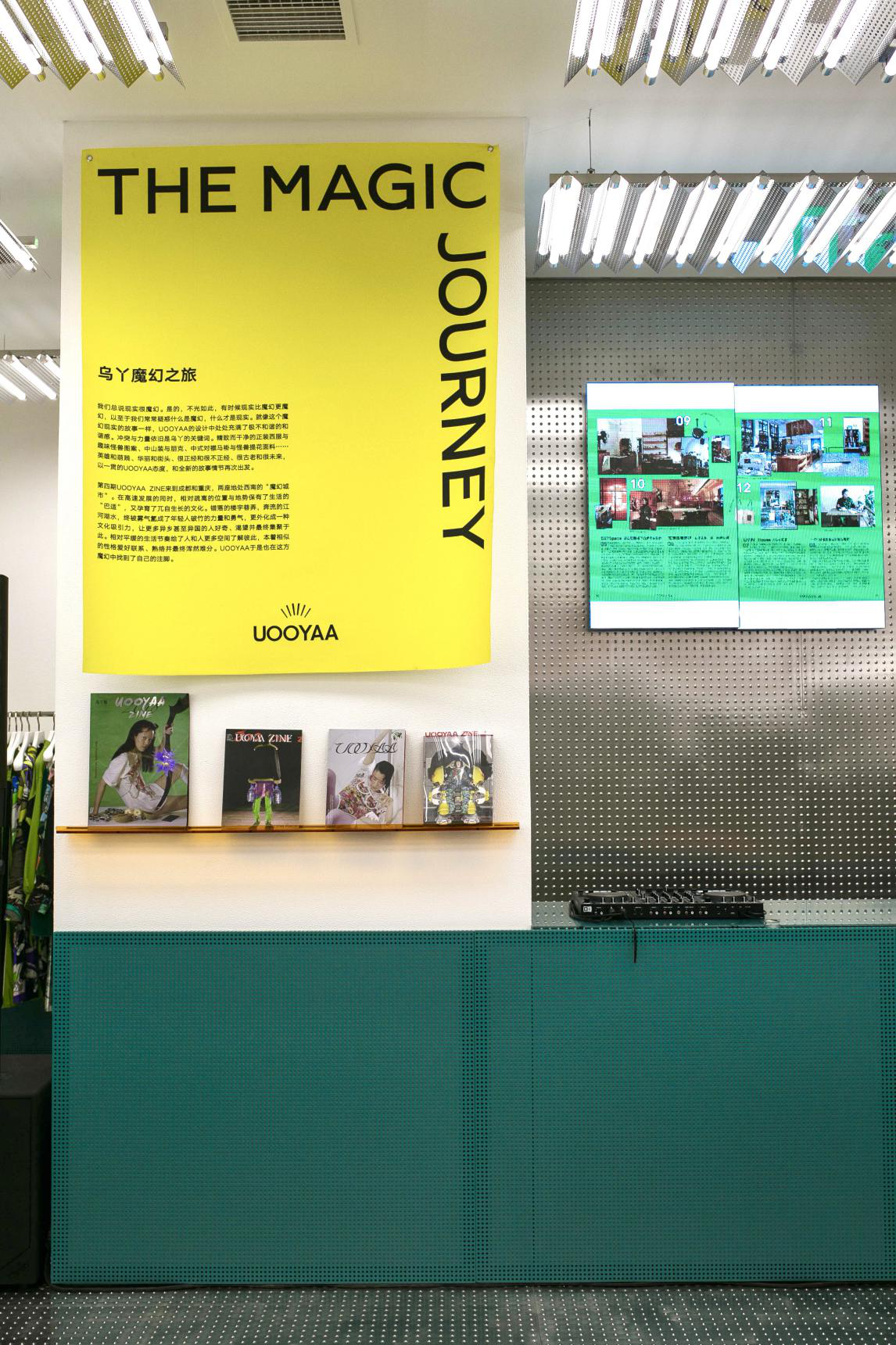 店内还有专门设立的UOOYAA ZINE杂志区以供驻足,UOOYAA ZINE 是UOOYAA的发声平台和对话窗口,她将成为UOOYAA除了服装之外和UOOYAA GIRLS沟通的另一种方式。以纸质出版物为媒介,以多元的UOOYAA精神为导向,挖掘时髦的、充满人文色彩的、艺术感的内容,以这种更立体化的方式传递给读者。她不仅仅是一本好看的读物,启发读者的穿搭灵感、传递日常生活中的真实与趣味将成为UOOYAA ZINE 的使命。全新一期UOOYAA ZINE,从魔都出发,抵达MAGIC CITIES-成都&重庆,开启这次魔幻之旅。