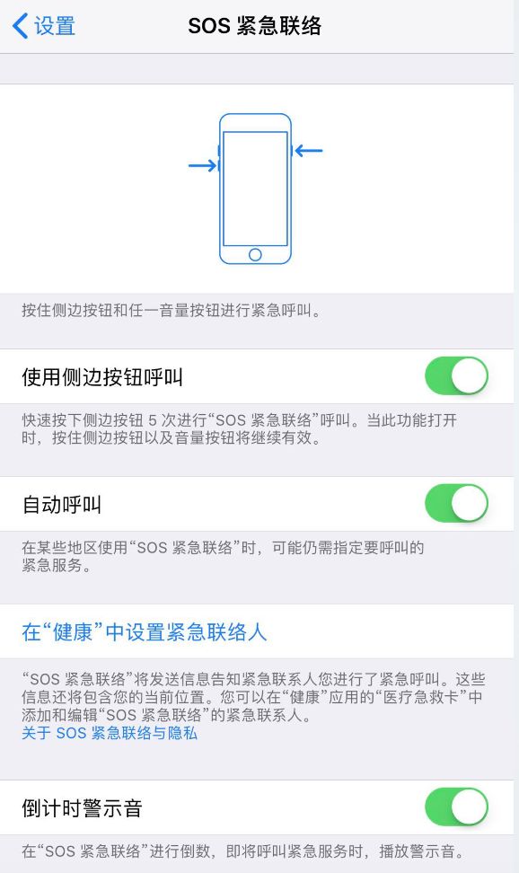 苹果用户可以设置“SOS紧急联络”,发生意外时,可以快速按5下电源按钮报警,只是大家注意一下设置,如果“倒计时警示音”是打开的话,报警时是会有很大声音的。(用于警示还不错,但如果刺激到对方就要小心啦~)