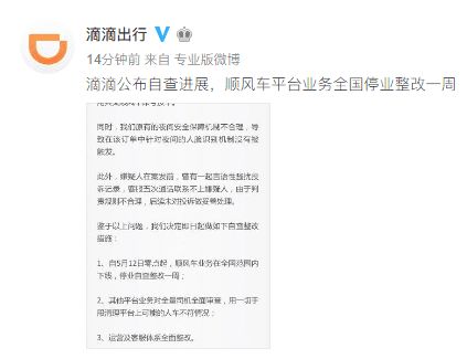 就在刚刚,滴滴公布自查进展,顺风车平台业务全国停业整改一周。